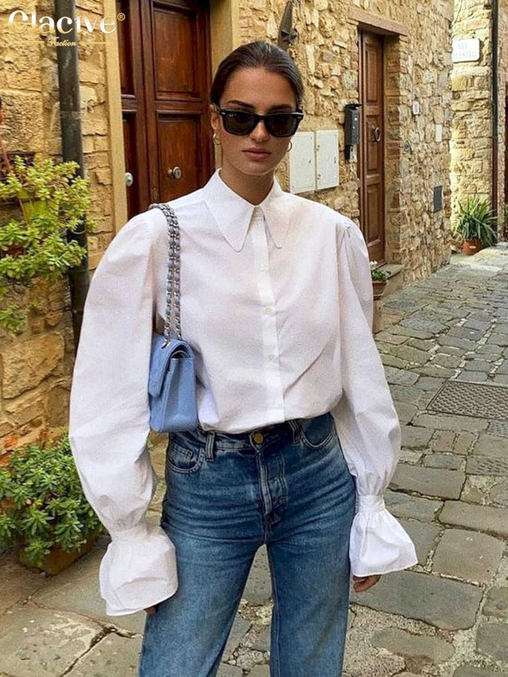 Blusas blancas holgadas de manga larga para mujer, camisa elegante con solapa para oficina, tops sencillos informales, ropa