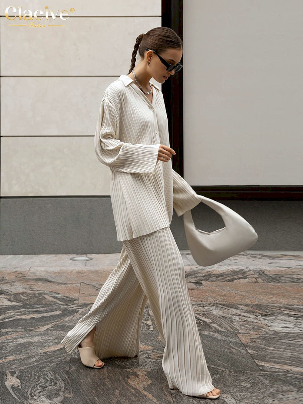 Compra Online Blusas de manga larga para mujer, conjuntos de pantalón ancho holgado informal, elegante, plisado, blanco