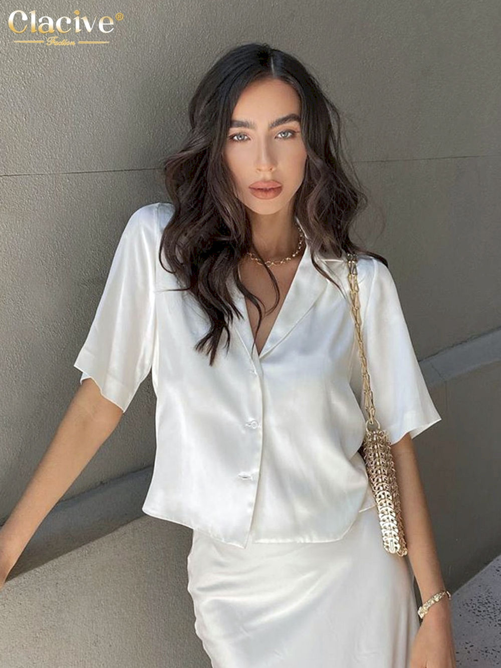 Compra Online Blusas de satén blancas para mujer, camisa de manga corta con solapa elegante para oficina, tops informales para mujer
