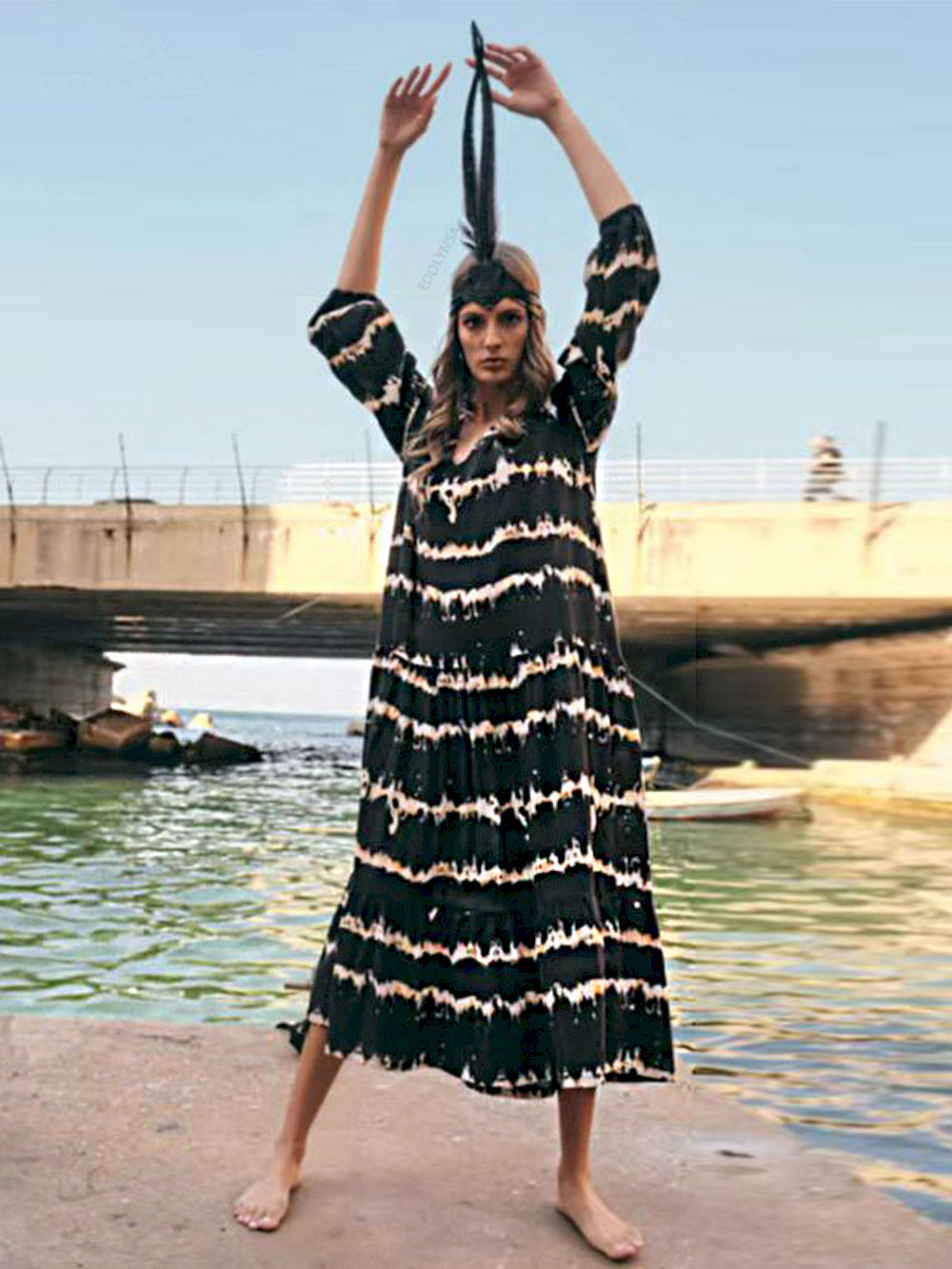 Compra Online Caftán a rayas vintage para mujer, Vestidos largos informal de manga larga con cuello en v, ropa de playa para otoño .