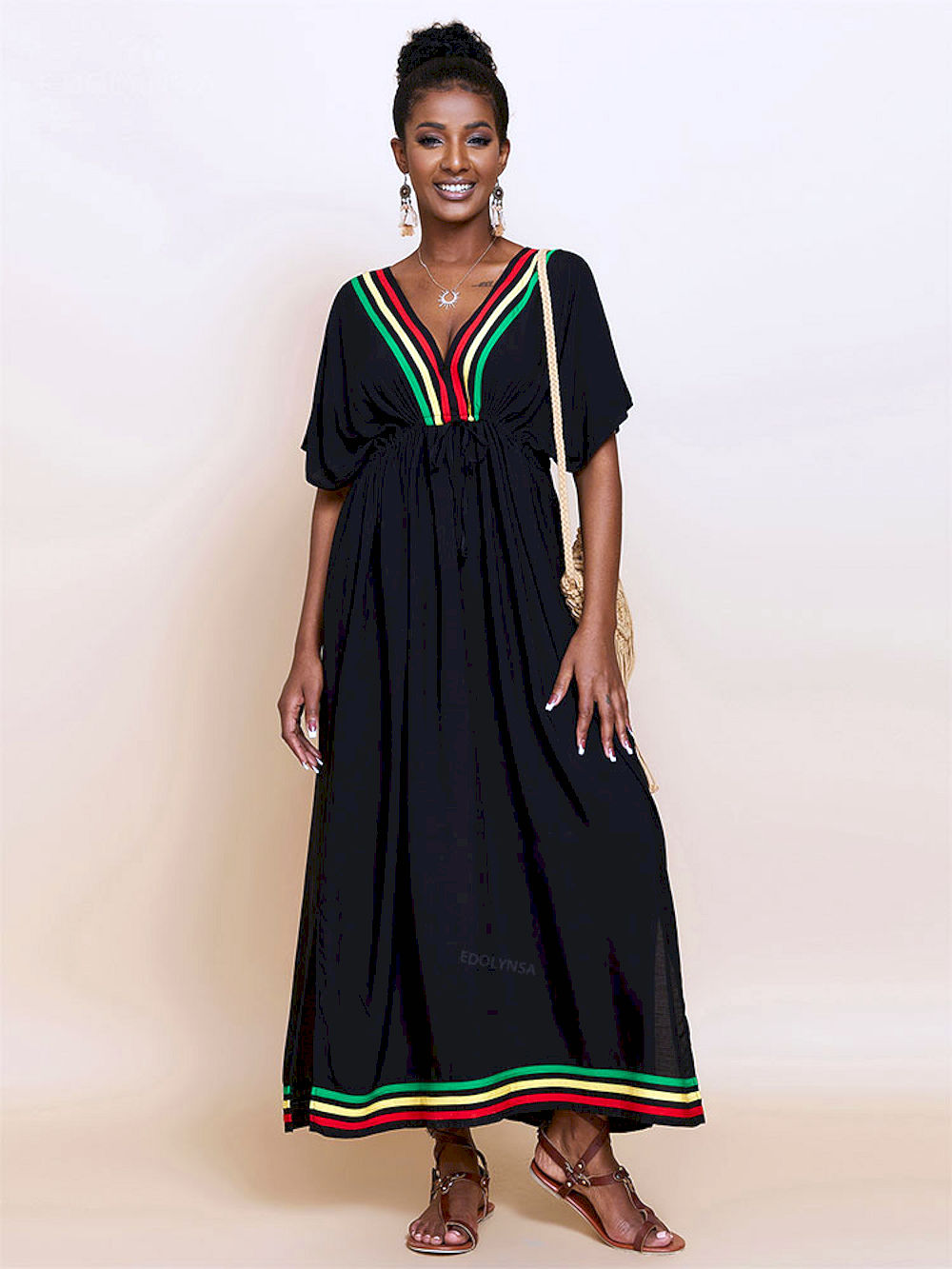 Compra Online Caftán largos informal con cuello en v para mujer, Vestidos largos de manga corta con abertura lateral, ropa de playa para vacaciones de verano.