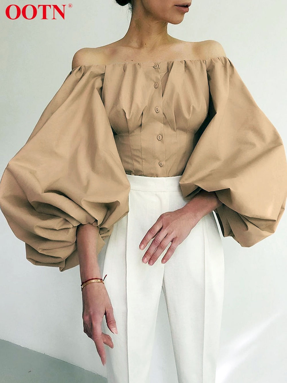 Compra Online Camisa ajustada con hombros descubiertos para mujer, Blusas blanca elegante plisada, túnica de manga linterna