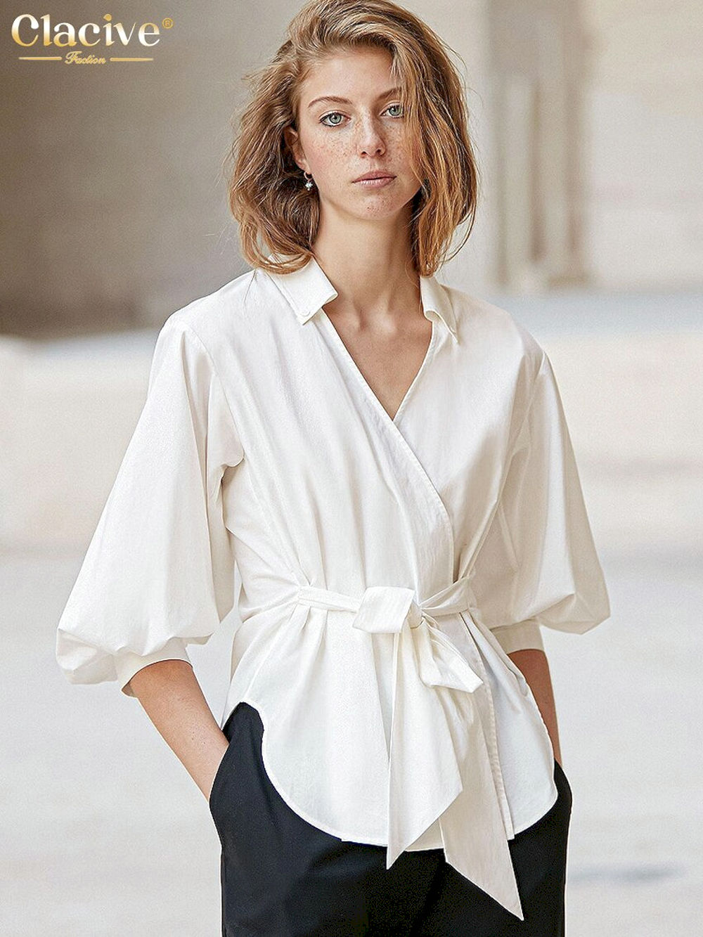 Compra Online Camisa blanca ajustada informal para mujer, Blusas de oficina con manga acampanada y solapa a la moda, tops elegantes con cordones para mujer