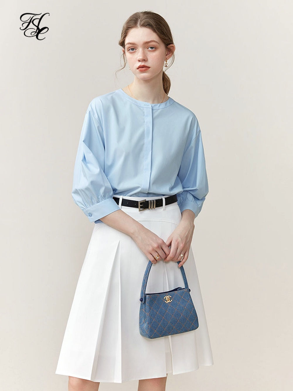 Camisa de cuello redondo para mujer, camisa sencilla de color sólido, manga de tres cuartos, de verano, temperamento francés, top de oficina para mujer