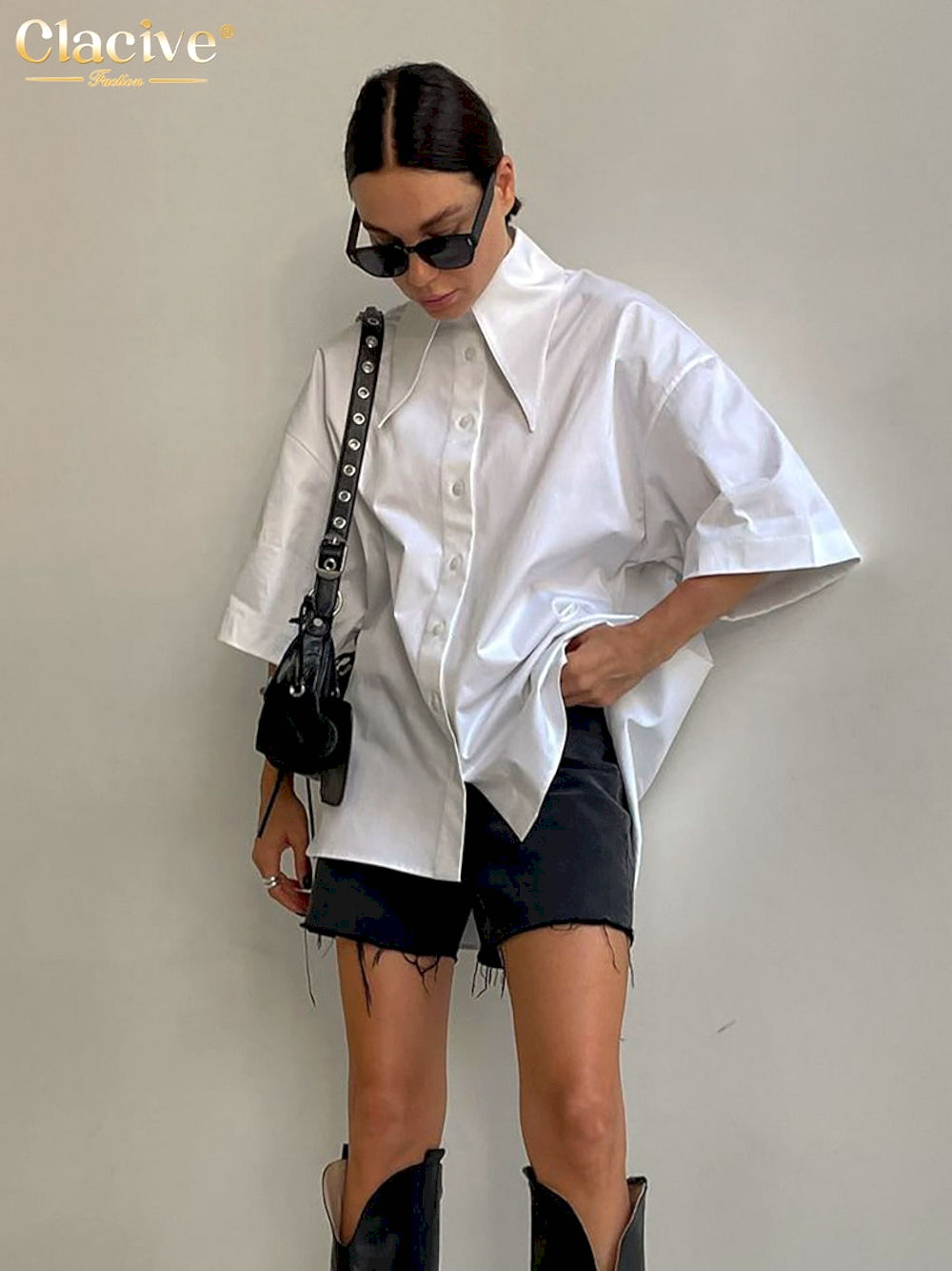 Camisa holgada de manga corta para mujer, Blusas informal de oficina, color blanco, elegante, de verano