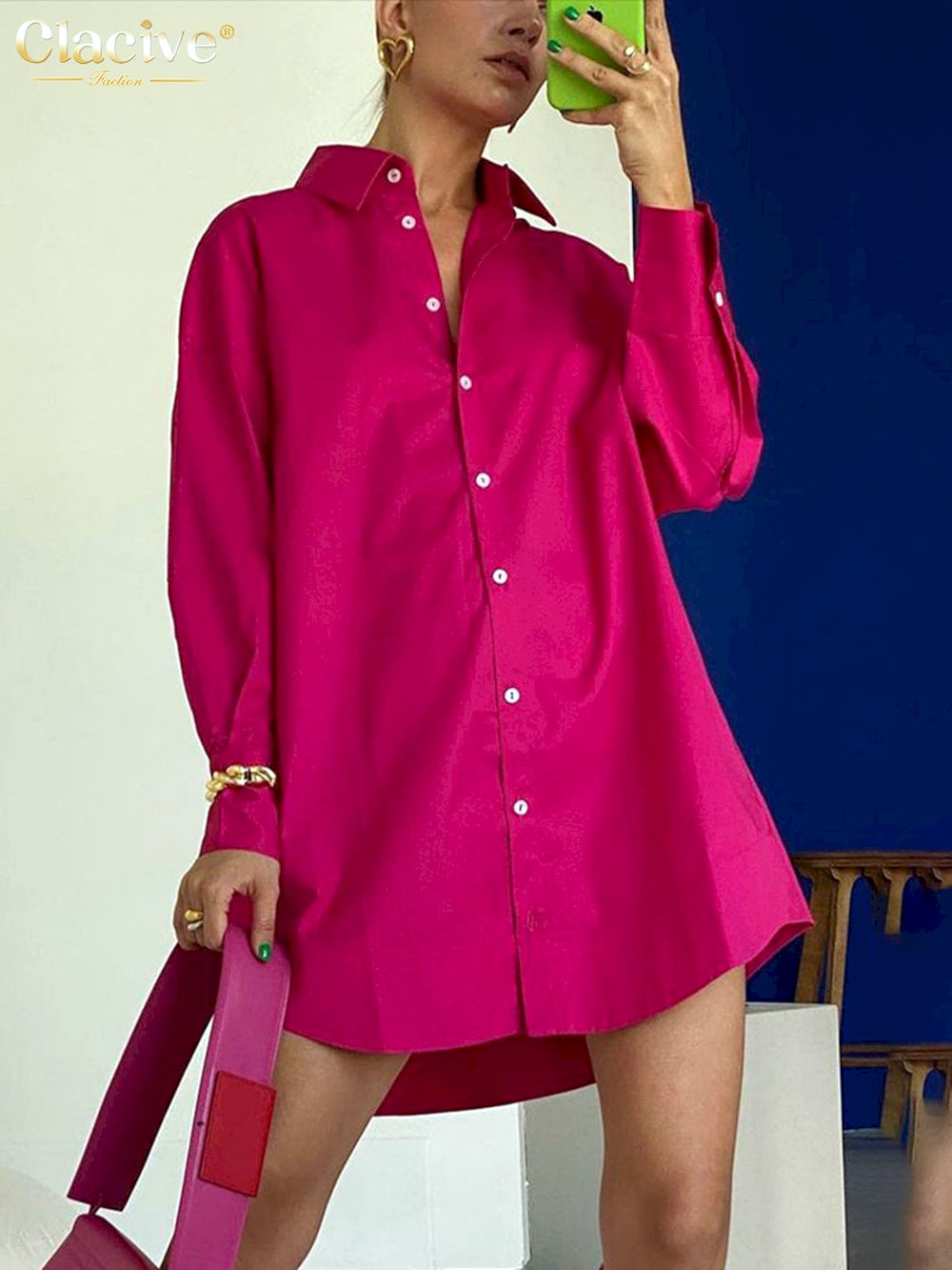 Camisa rosa holgada informal para mujer, Blusas elegante de manga larga a la moda para oficina, blusas sencillas con solapa azul, tops para mujer