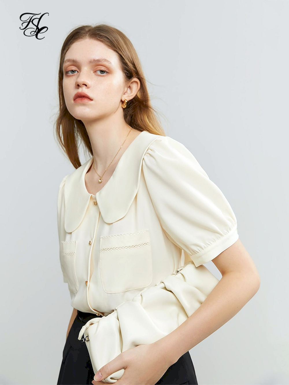 Compra Online Camisas de manga corta con cuello peter pan para mujer, blusas informales de color sólido para viaje, blusas reductoras de edad para mujer