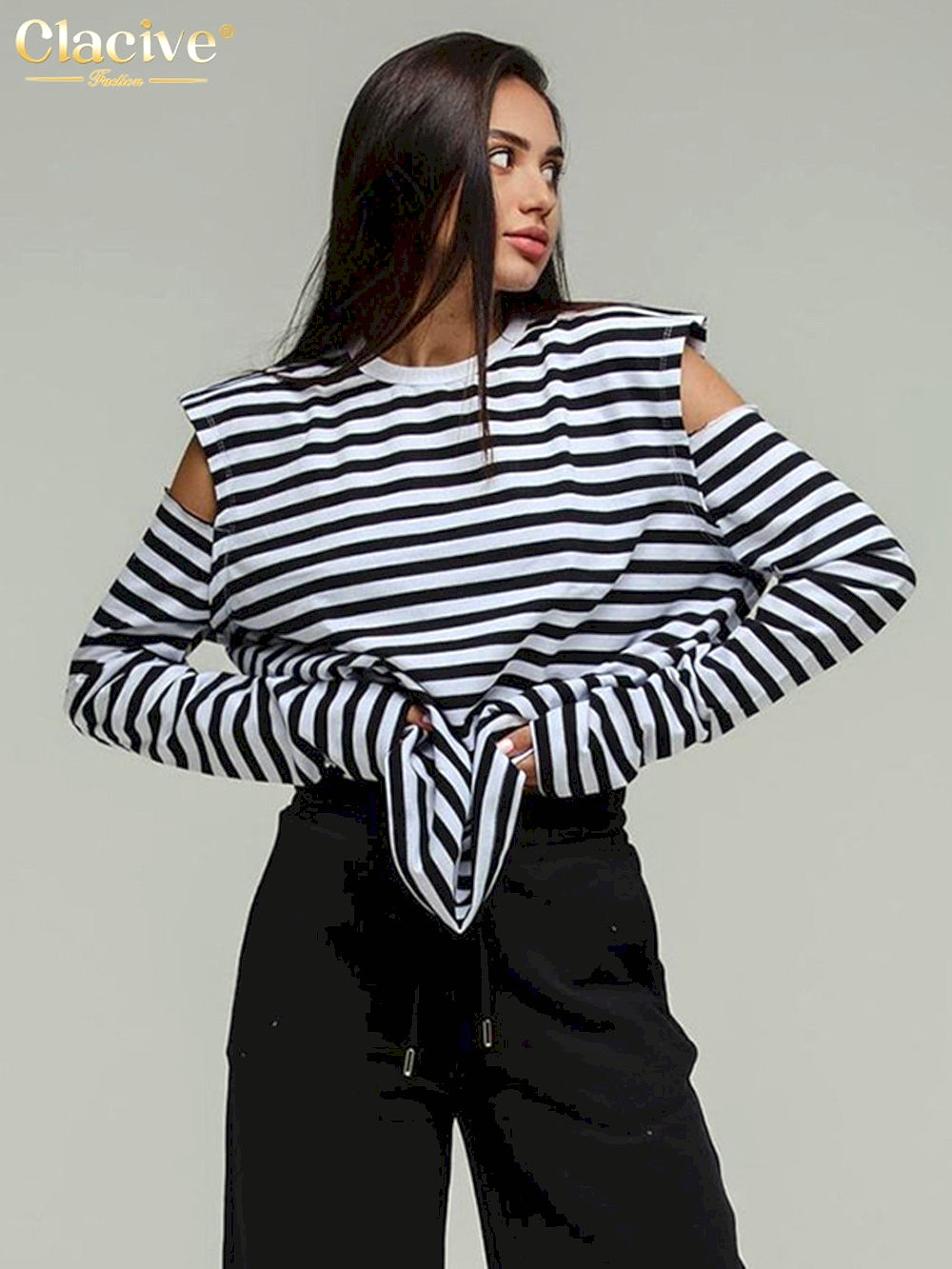 Compra Online Camisetas a rayas negras para mujer, Blusas elegante de manga larga con cuello redondo y hombros descubiertos, ropa de calle para mujer