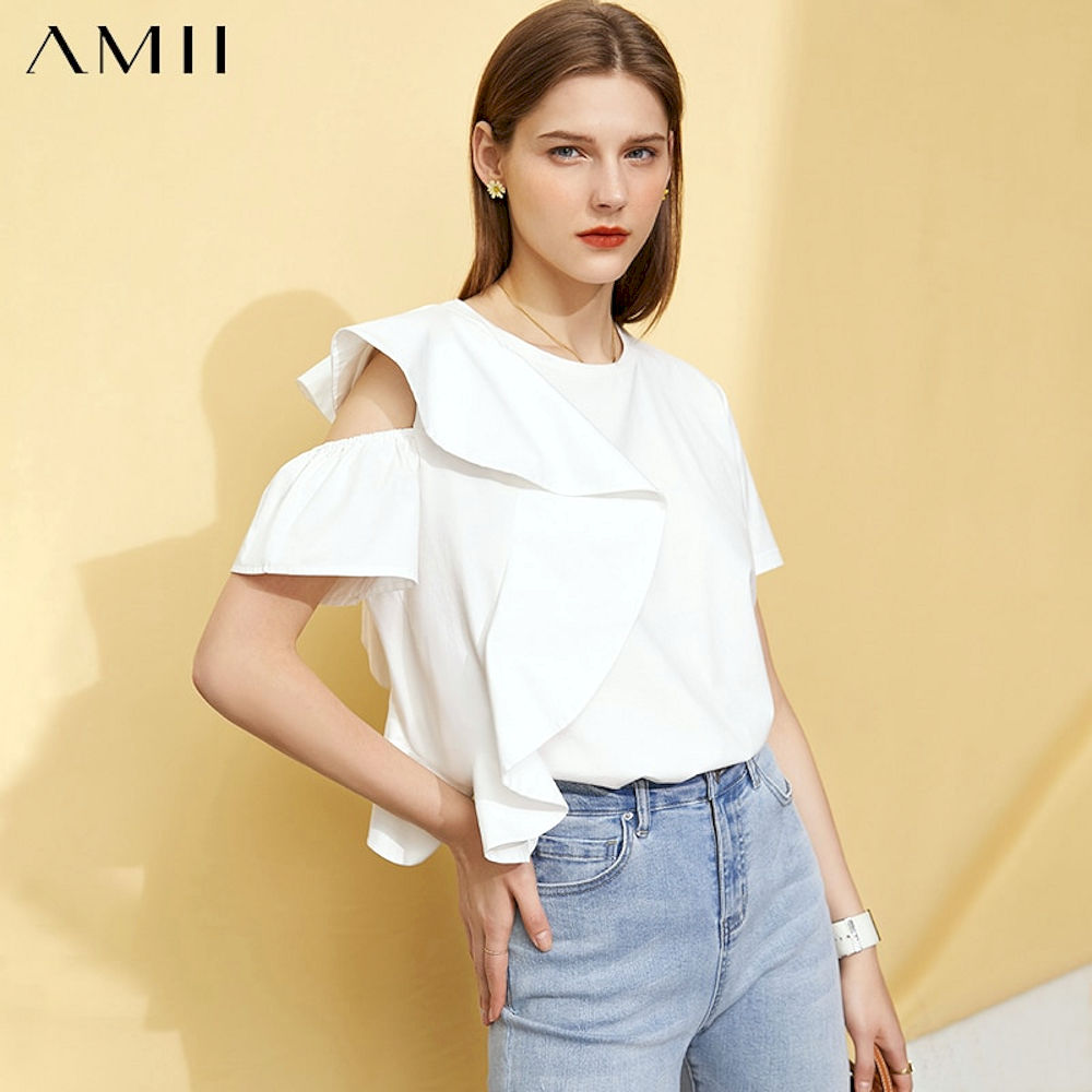 Compra Online Camisetas minimalistas para mujer, ropa de calle de cuello redondo, Blusas de manga con volantes, tops informales para mujer
