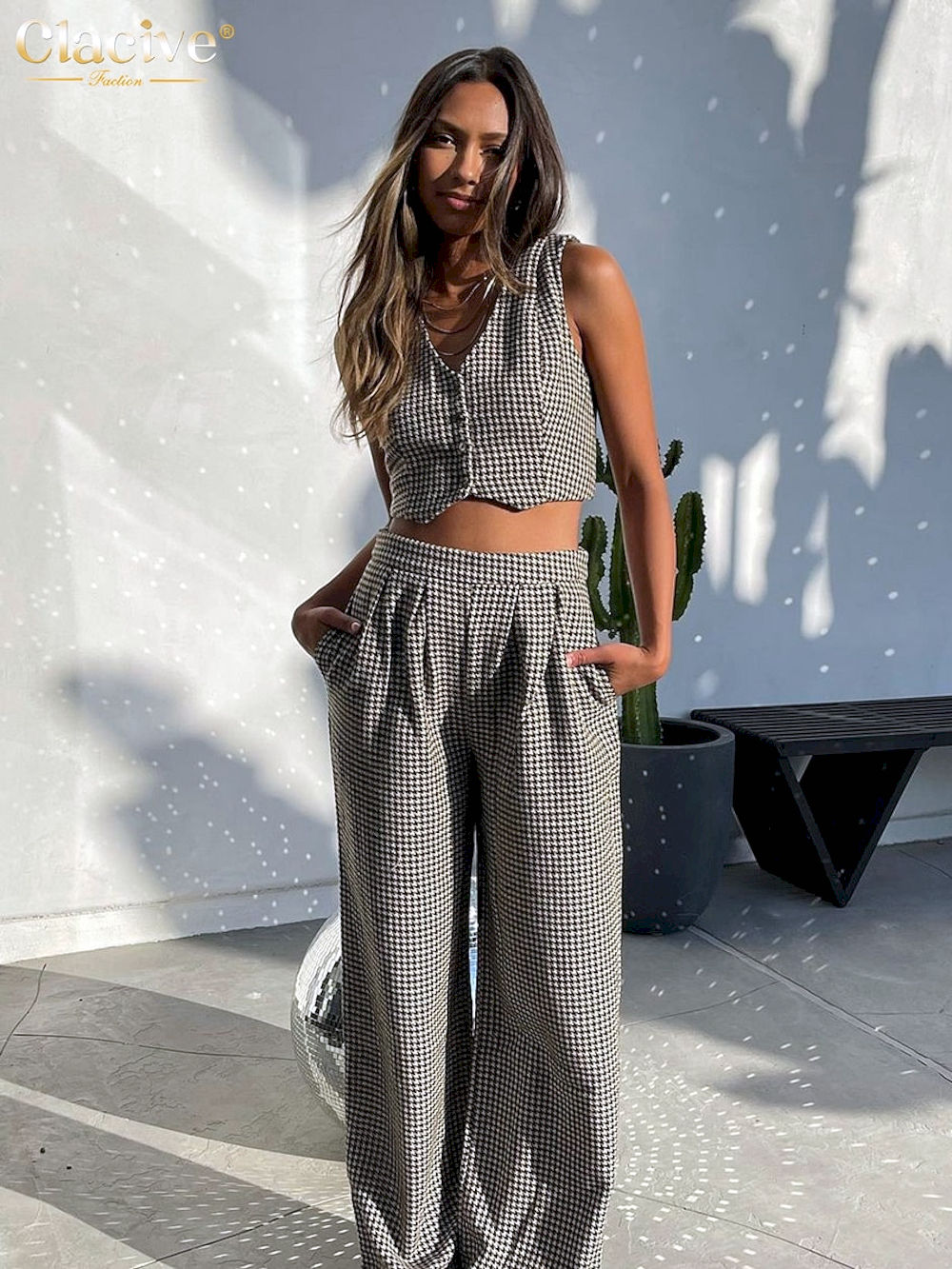 Conjunto de dos piezas con estampado a cuadros para mujer, top cortos sin mangas con cintura alta y pantalón ancho, moda femenina