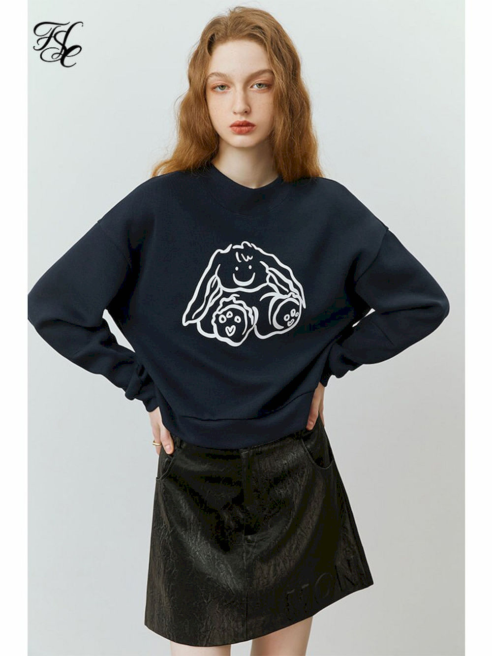 Estampado de conejo de algodón para mujer, jerseys de cuello redondo azul marino, Suéteres de lana informal de diseño de funda caída, tops