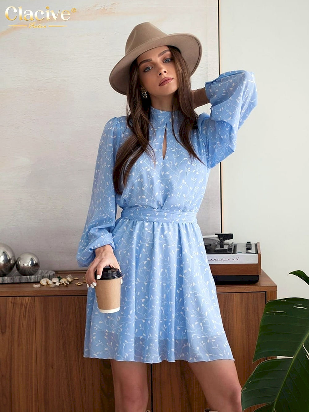 Holgado Vestidos cortos de manga larga con cuello levantado para mujer, Mini Vestidos plisado para oficina, elegante. la moda,