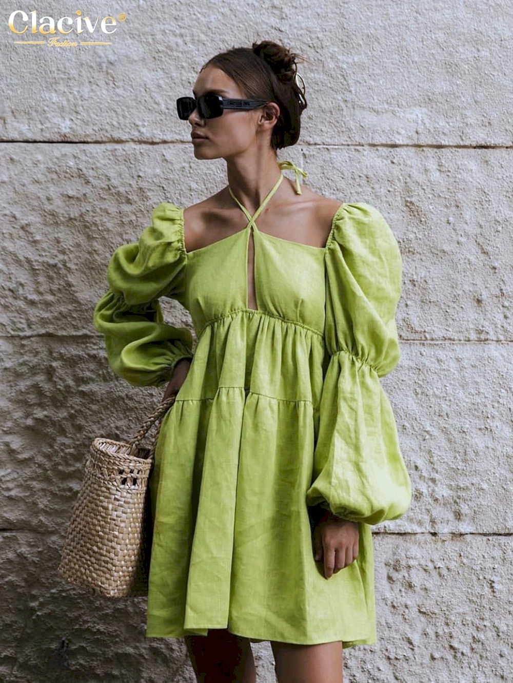 Compra Online Mini Vestidos con cuello halter y cordones para mujer, Vestidos de otoño con mangas abullonadas, vintage, elegante, fruncido, para fiesta