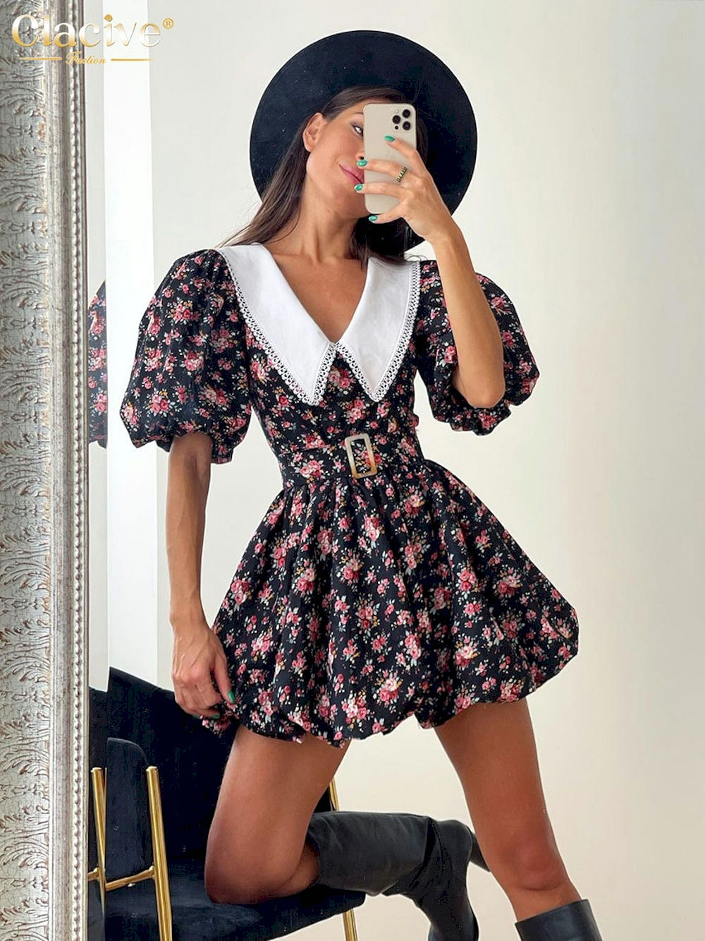 Mini Vestidos plisado de cintura alta para mujer, vestidos vintage con estampado ajustado. la moda, con cuello de muñeca y manga abullonada