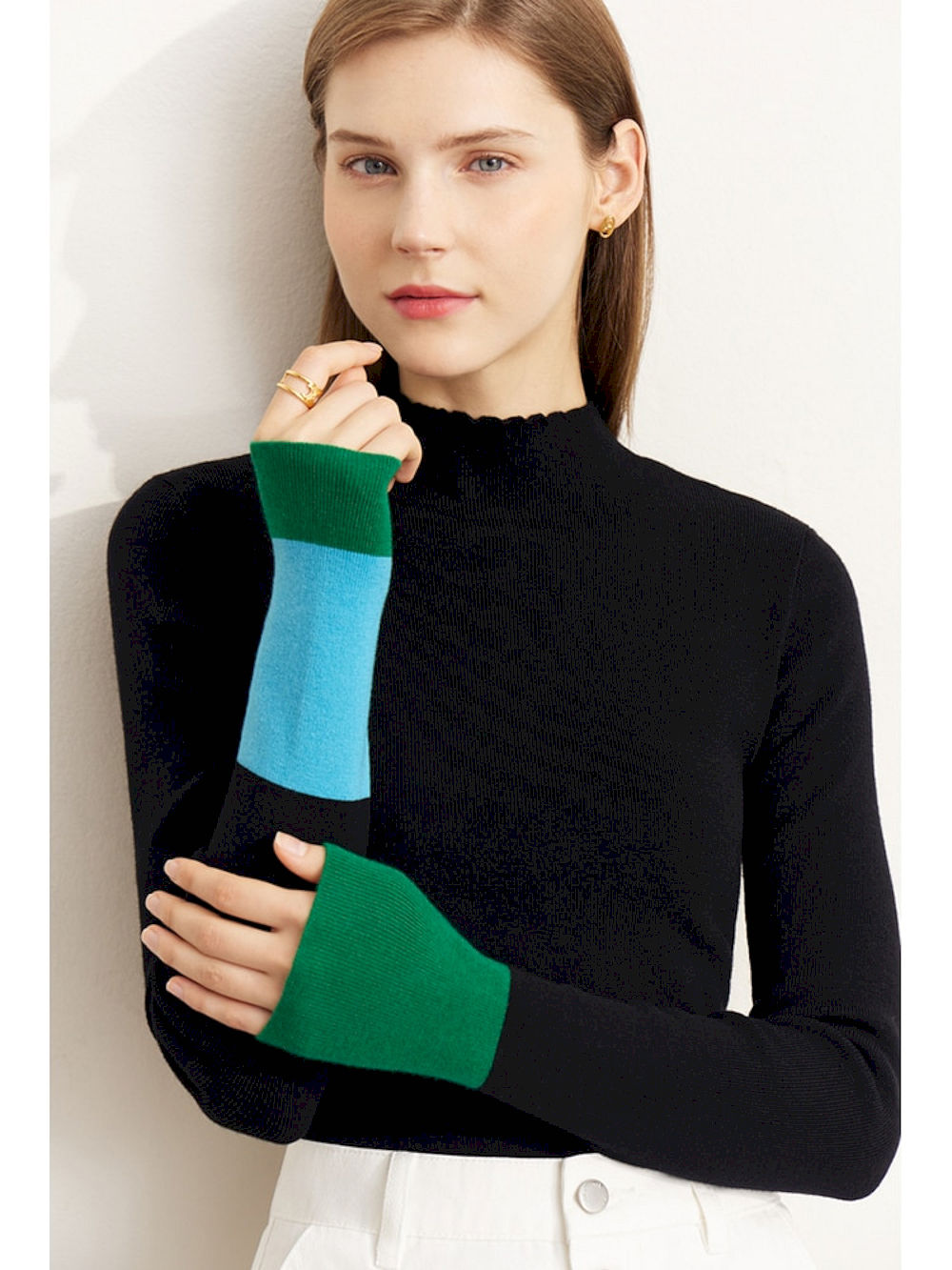 Compra Online Suéteres cálidos minimalistas para mujer, Suéteres de cuello alto de punto de retales para oficina, ,