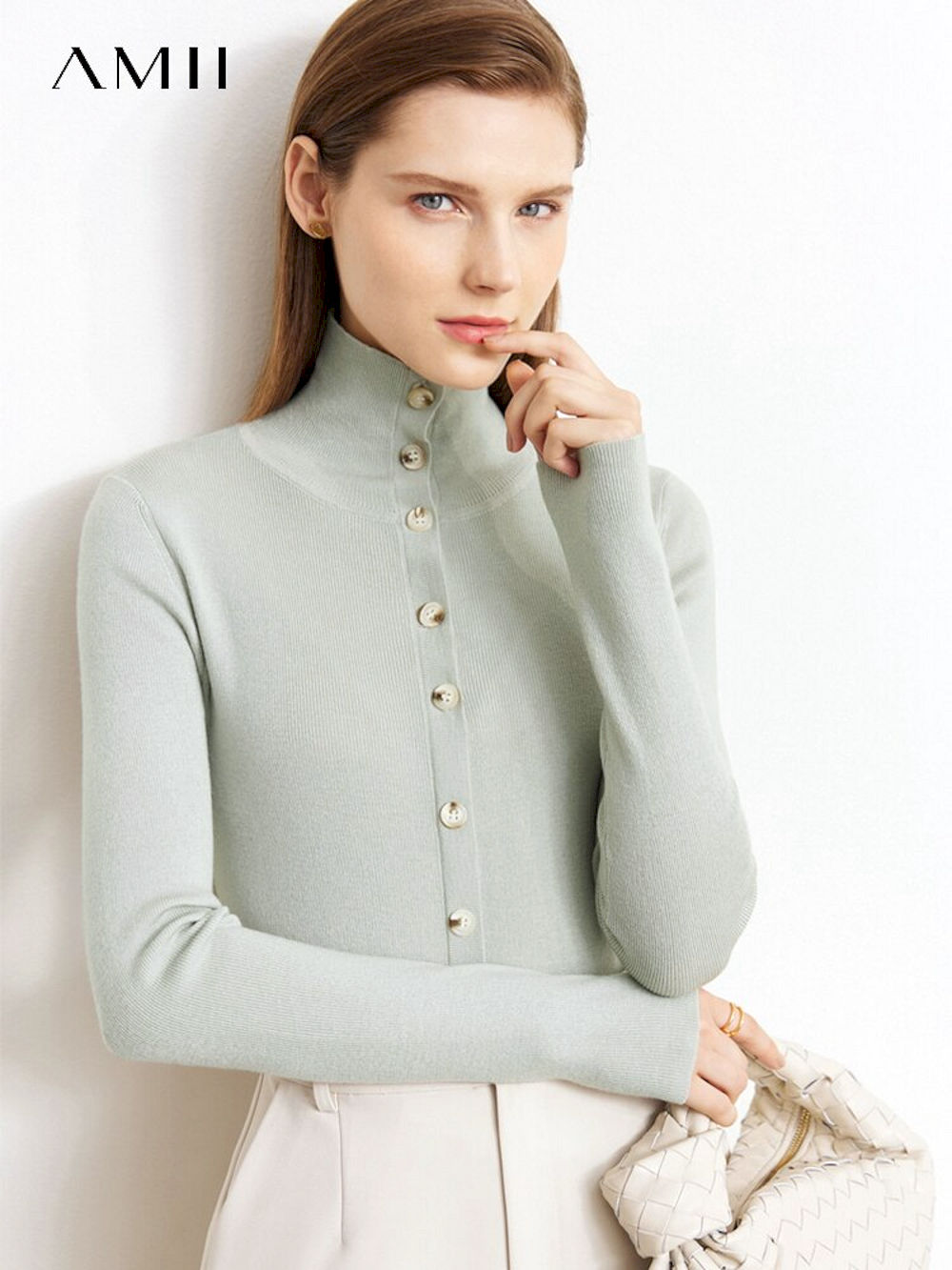 Compra Online Suéteres minimalistas para mujer, cárdigan de punto liso de un solo pecho, vintage, ajustado, combina con todo, cuello alto,