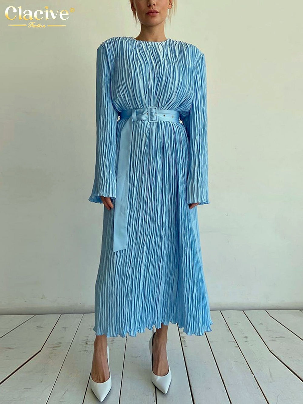Compra Online Vestidos azul de manga larga para mujer, prenda informal. la moda, cuello redondo, holgado, vintage, elegante,