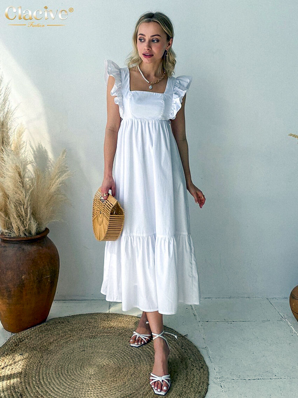 Compra Online Vestidos blanco holgado de verano para mujer, Vestidos elegante sin mangas con cuello cuadrado y volantes,