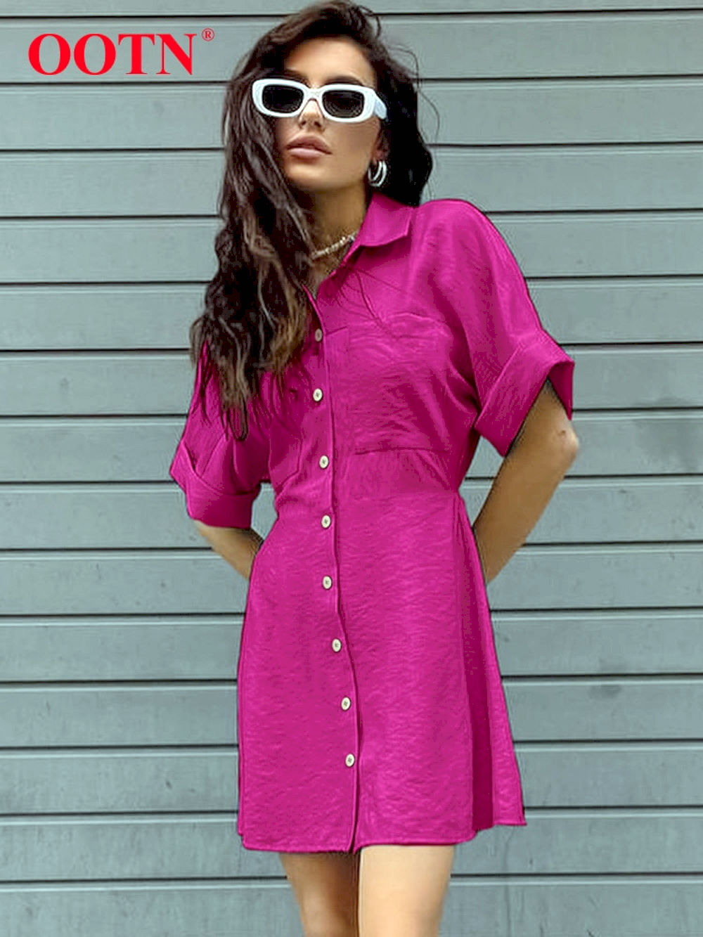 Compra Online Vestidos camisero blanco con cuello vuelto para mujer, Mini Vestidos de calle de manga corta a la moda de verano,