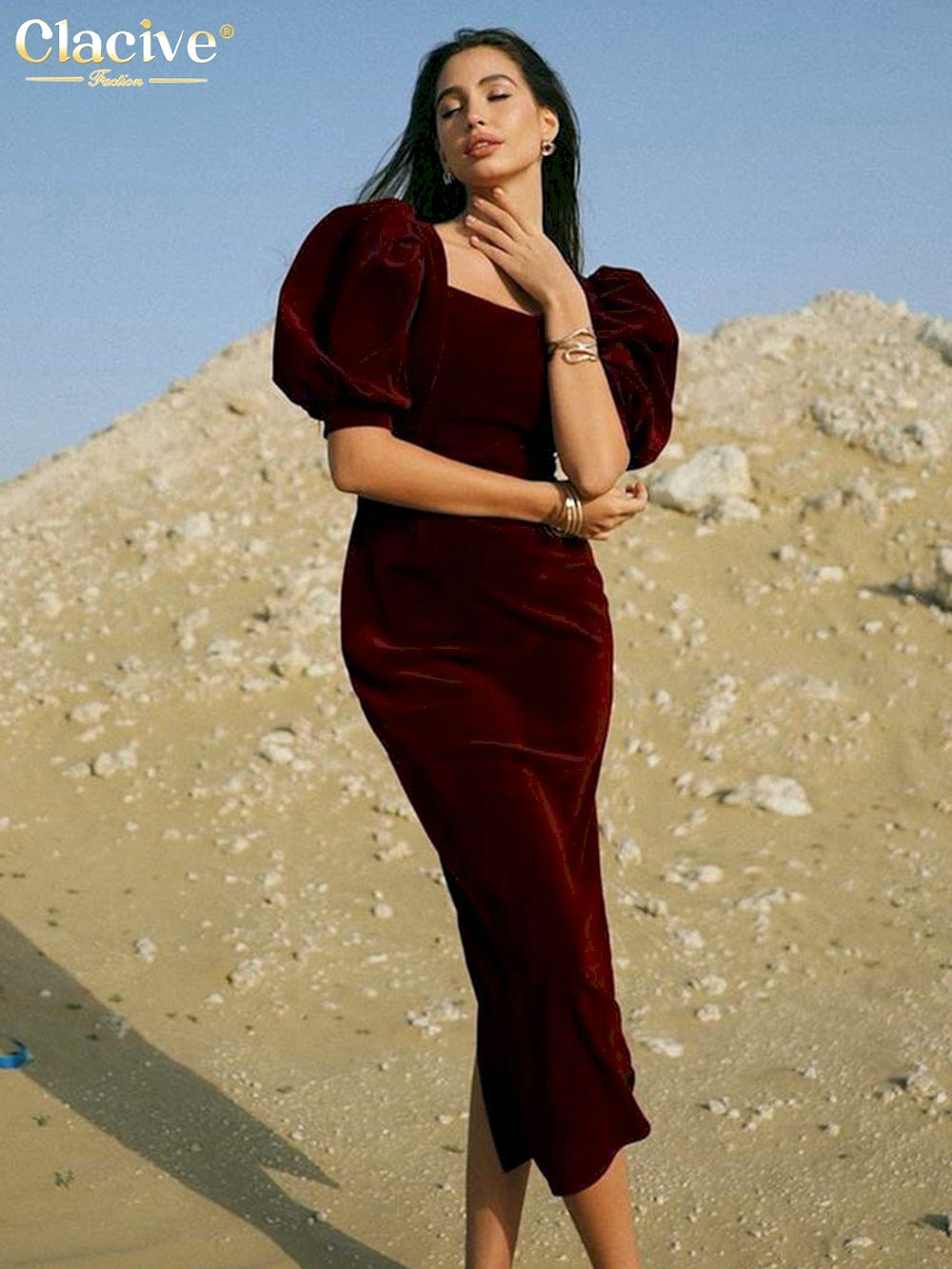 Compra Online Vestidos ceñido de terciopelo rojo para mujer, elegante Vestidos midi de manga corta con cuello cuadrado, cintura alta