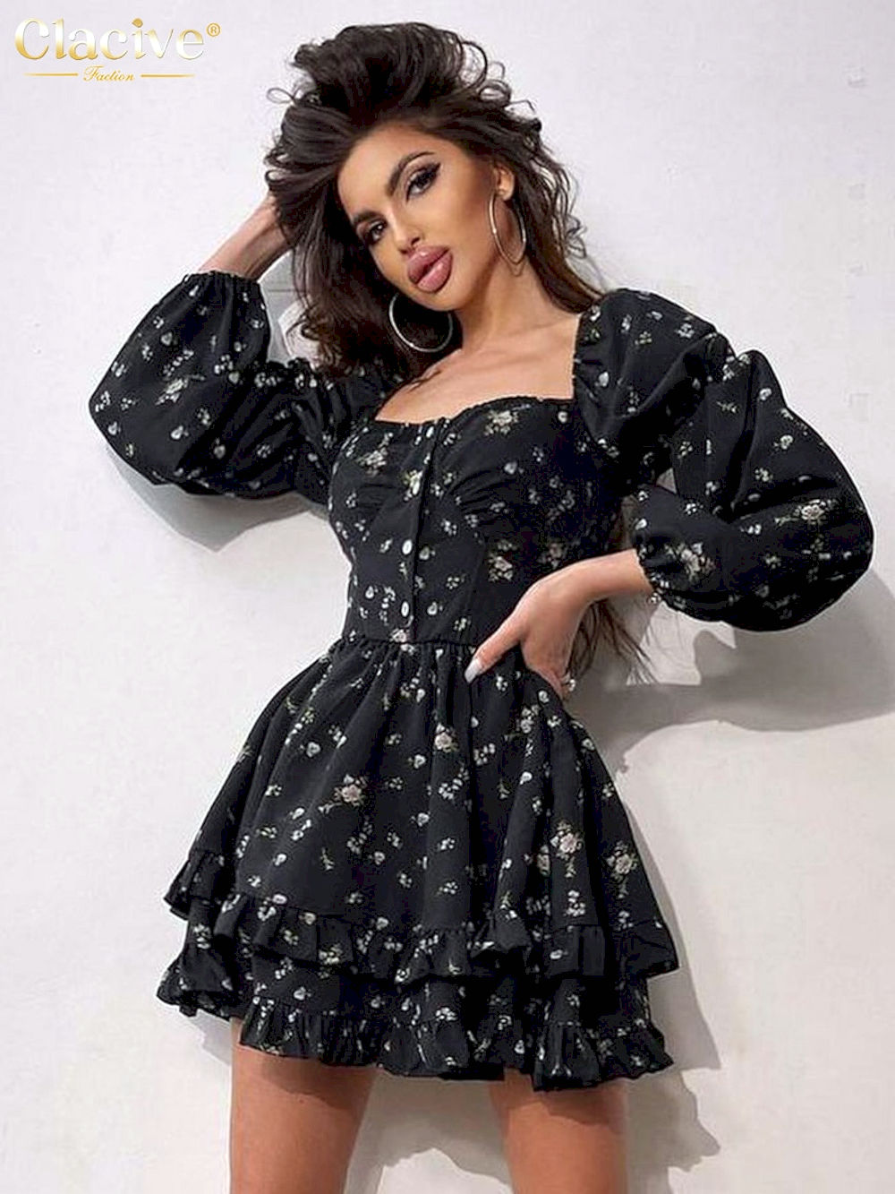 Compra Online Vestidos cortos ajustado de manga larga con cuello cuadrado para mujer, Mini Vestidos elegante de cintura alta con volantes,