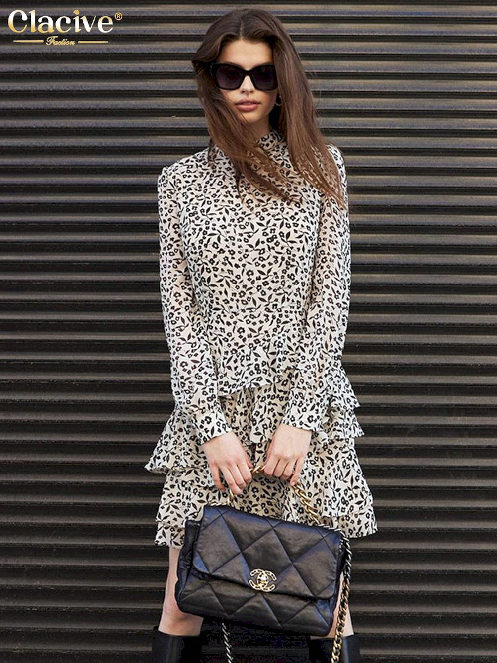 Compra Online Vestidos cortos clásico informal de manga larga con volantes para mujer, Mini Vestidos elegante con cuello redondo y estampado a la moda,