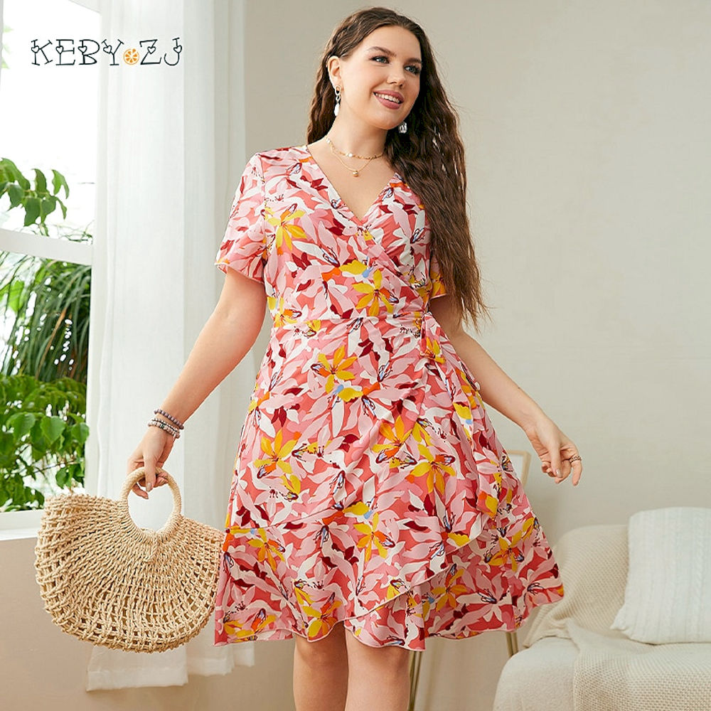 Compra Online Vestidos cortos informal de verano para mujer, Mini Vestidos playero de talla grande con cuello de pico, manga corta, cintura para vacaciones, xxxl, xl,