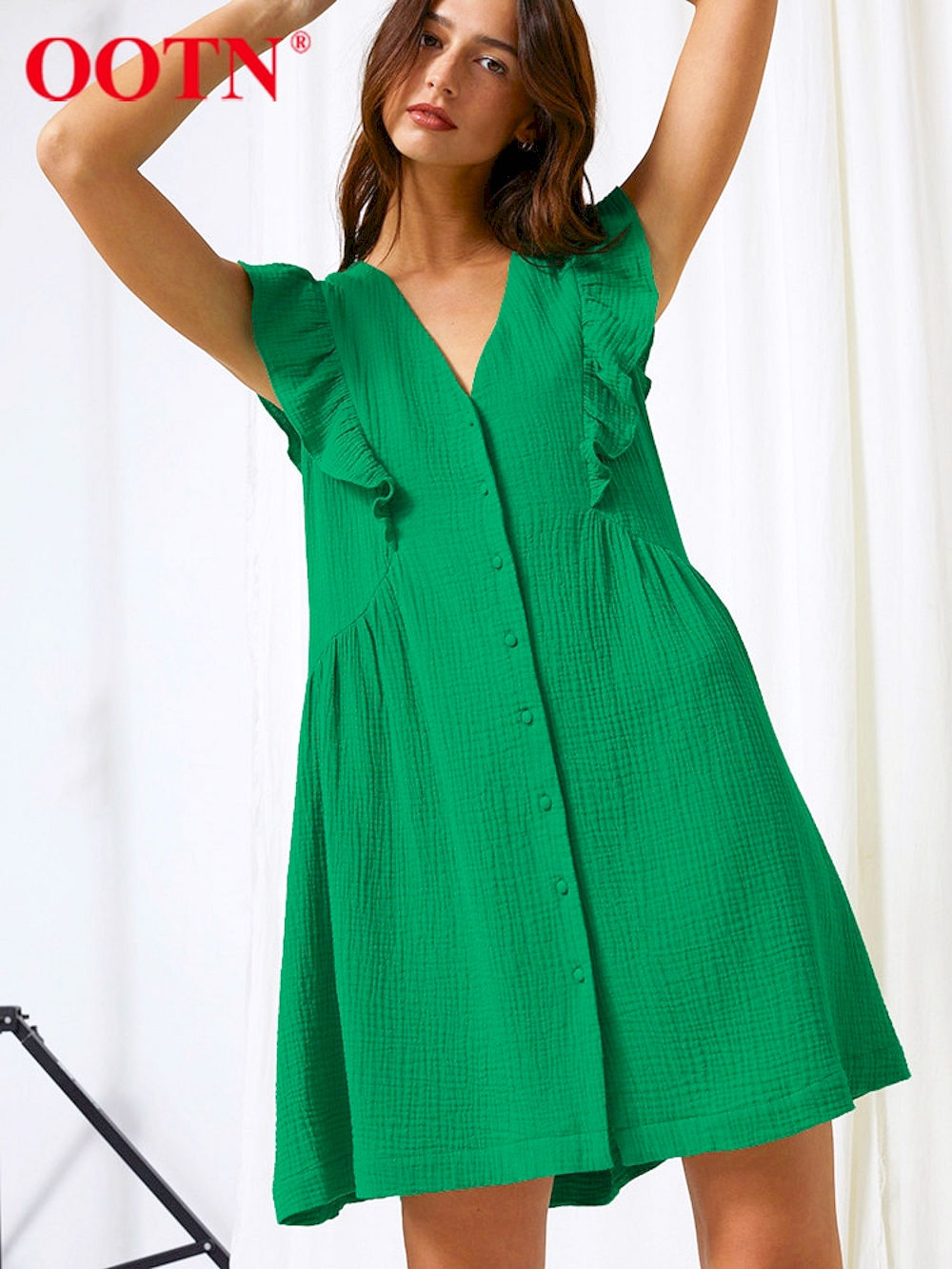 Compra Online Vestidos cortos informal para mujer, prenda cómoda de algodón % con cuello en v y manga voladora, elegante, verde, con botonadura única