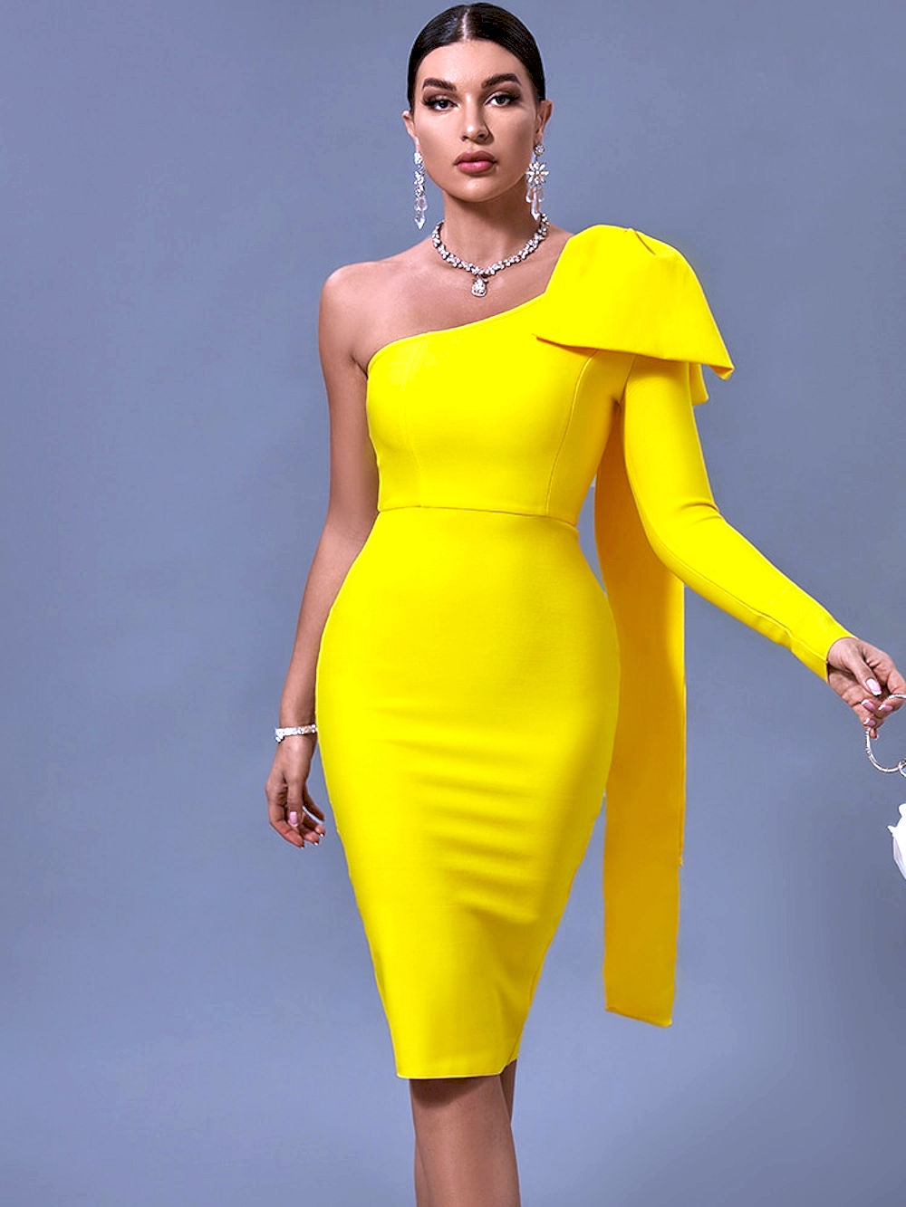 Compra Online Vestidos de manga larga de vendaje para mujer, Vestidos amarillo elegante, sexy, con lazo, para fiesta y club nocturno, de alta calidad, verano,