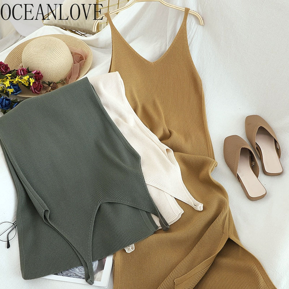 Compra Online Vestidos de punto liso con cuello en v para mujer, ropa informal simple. la moda coreana, elegante novedad de