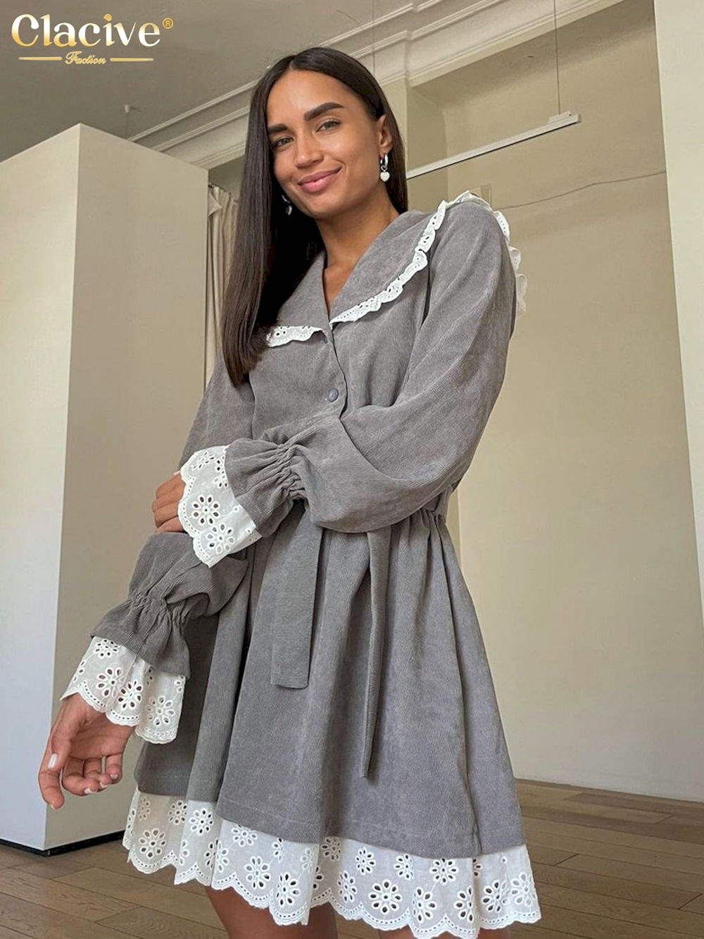 Vestidos grises holgados de moda para mujer, Mini Vestidos informal de manga larga con cuello de muñeca, Vestidos elegante de retazos con cordones para mujer