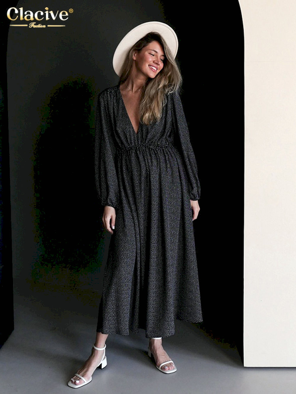Vestidos holgado con estampado para mujer, prenda de manga larga con cuello en v profundo, hasta el tobillo, elegante, de cintura alta
