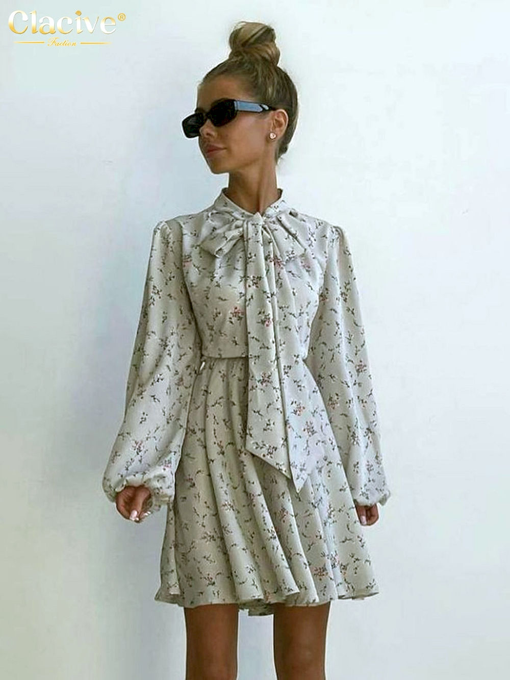 Vestidos holgado vintage para mujer, Mini Vestidos informal de cintura alta con cuello de lazo y mangas abullonadas para oficina,