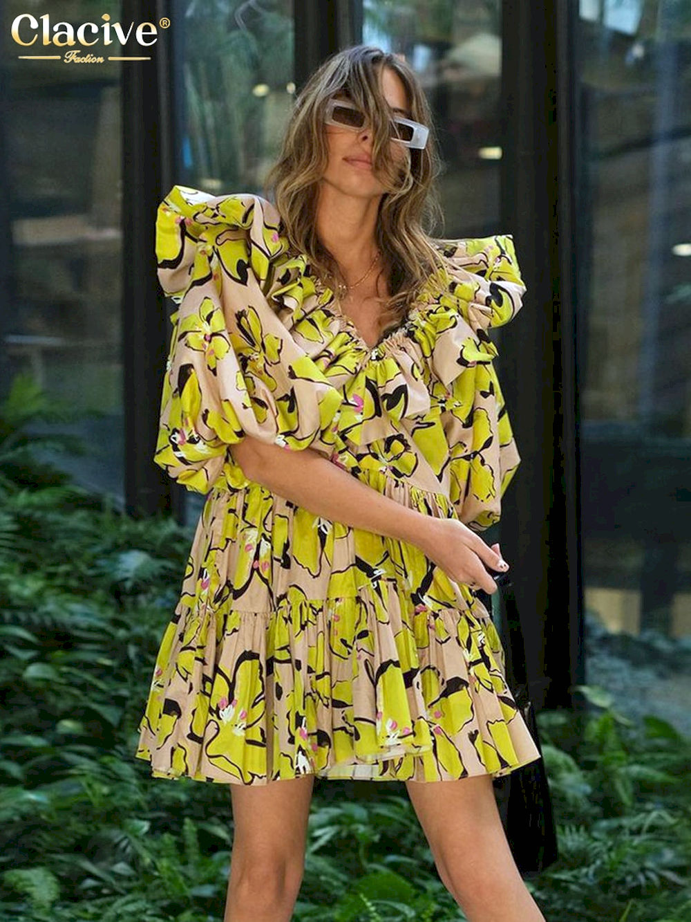 Vestidos holgados con estampado para mujer, Mini Vestidos informal con cuello en v y manga abombada, elegante, con volantes y cintura alta,