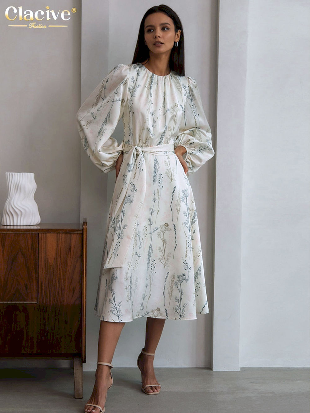 Compra Online Vestidos midi de manga larga con cuello redondo para mujer, prenda elegante con estampado, informal, clásico, con cordones