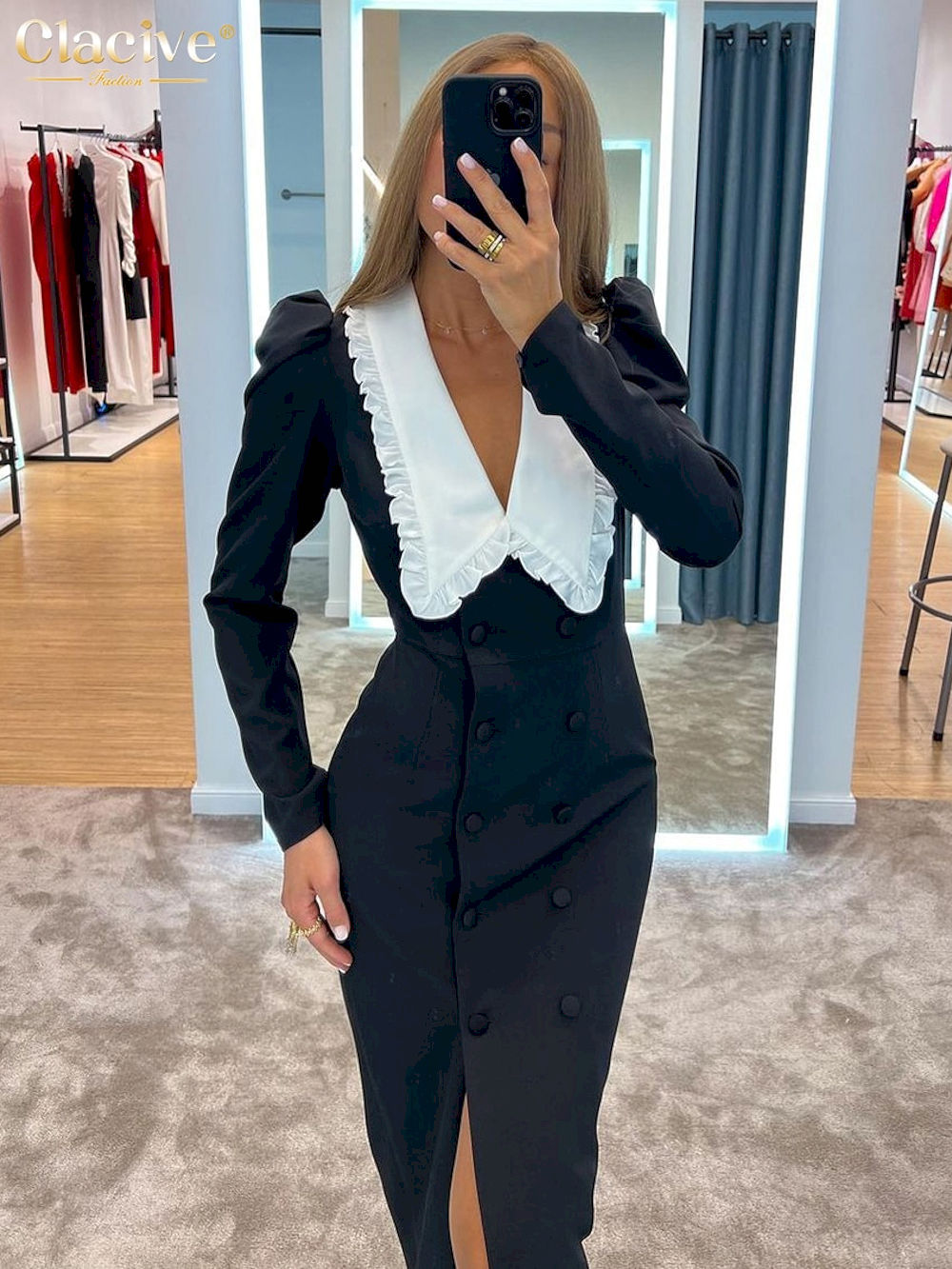 Vestidos negro ajustado de retales para mujer, elegante Vestidos midi de oficina de manga larga con cuello con volantes. la moda