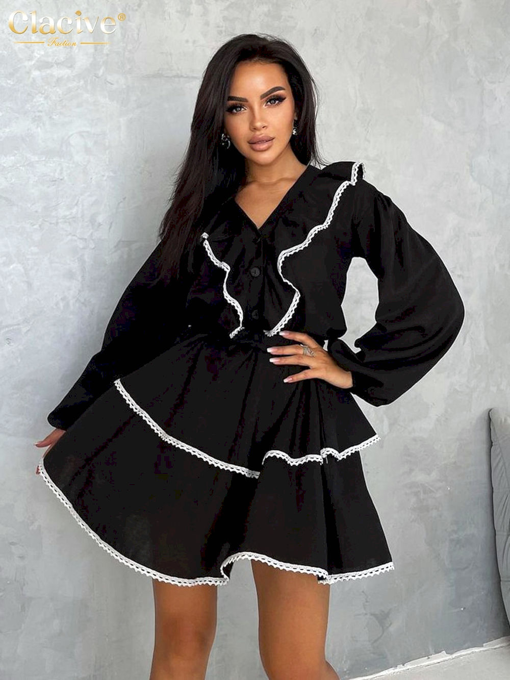 Vestidos negro holgado de manga larga para mujer, Mini Vestidos elegante con cuello en v para oficina, informal, de cintura alta, con volantes