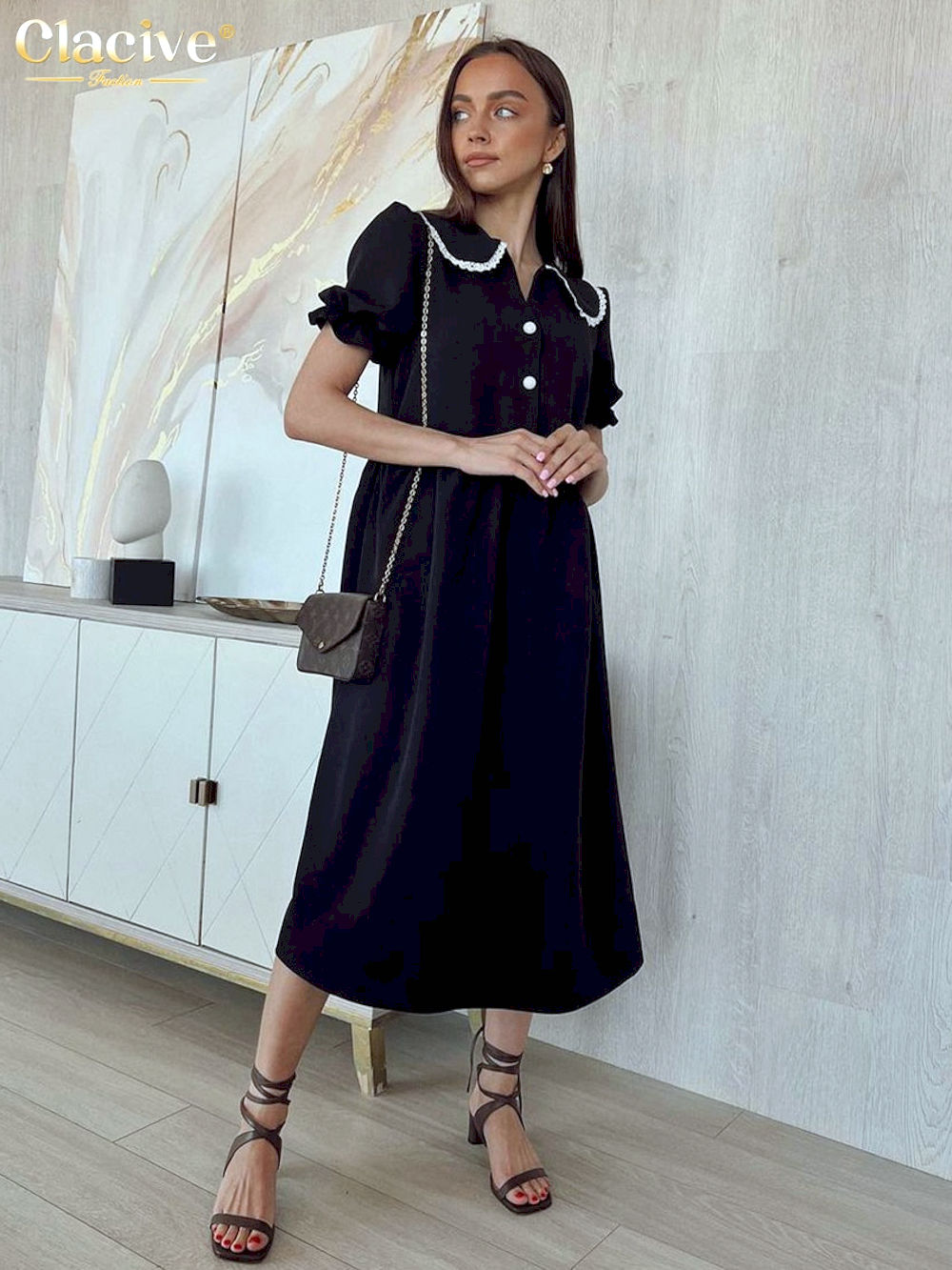 Vestidos negro holgado elegante para mujer, Vestidos femenino clásico de manga corta con cuello de muñeca para oficina