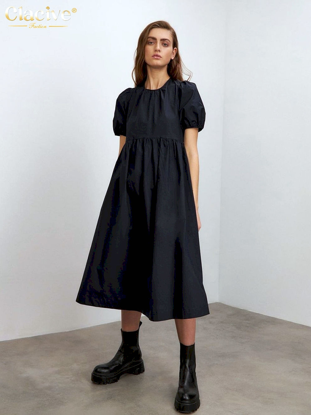 Compra Online Vestidos negro holgado informal para mujer, Vestidos midi de oficina de manga corta con cuello redondo, elegante, de cintura alta, de verano