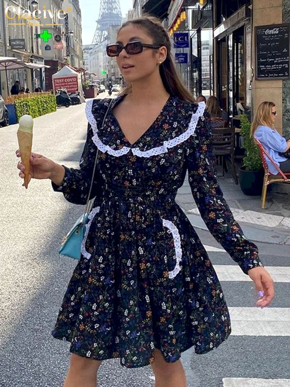 Compra Online Vestidos vintage holgado con estampado para mujer, Mini Vestidos informal de manga larga con cuello de muñeca, con volantes